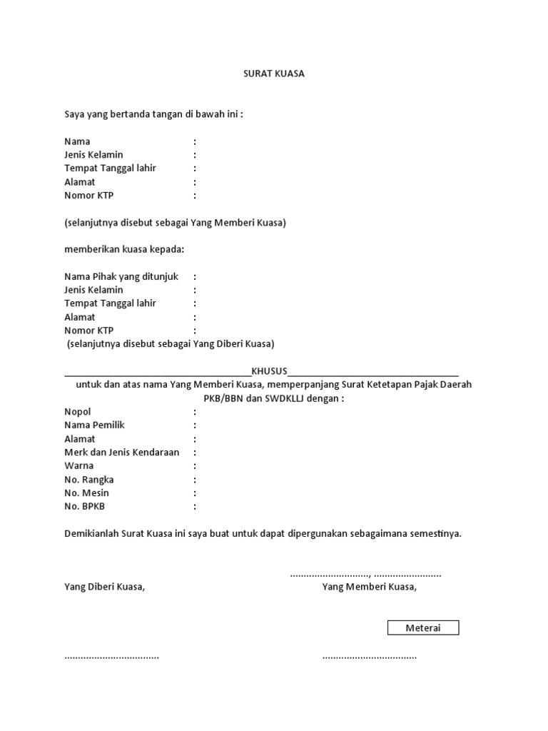 Dengan ini pemberi kuasa memberikan kuasa, berupa : Jika anda membeli sebuah kendaraan, biasanya surat kepemilikan tersebut tidak dapat langsung diambil hari itu juga. Surat kuasa untuk mengurus pajak kendaraan, mutasi kendaraan, balik nama atau pengambilan bpkb#suratkuasa#pajakkendaraan#mutasikendaraan#baliknama#. Surat kuasa biasanya digunakan untuk mengurus berbagai permasalahan administrasi. Bpkb (buku pemilik kendaraan bermotor) merupakan buku yang dikeluarkan atau diterbitkan oleh satuan lalu lintas polri yang menjadikan bukti kepemiilikan kendaraan bermotor.